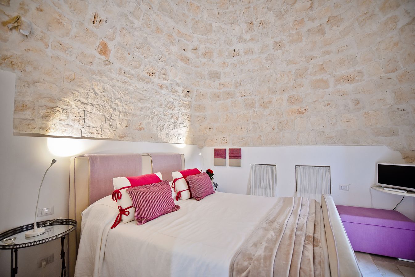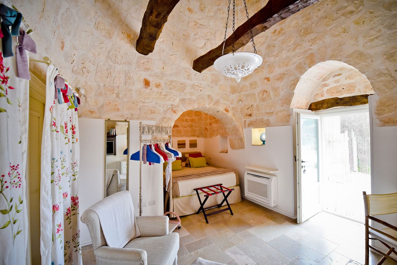 - 1 Suite im Trullo (29 m²) für 2+2 Personen, ein Schlafzimmer im Erdgeschoß mit zwei Einzelbetten, ein Schlafzimmer im Obergeschoß mit Französischem Bett, Badezimmer im Erdgeschoß, Kitchenette, Kaminofen und eigenem Garten. Wichtig: das Obergeschoß ist nur durch eine externe Treppe erreichbar!