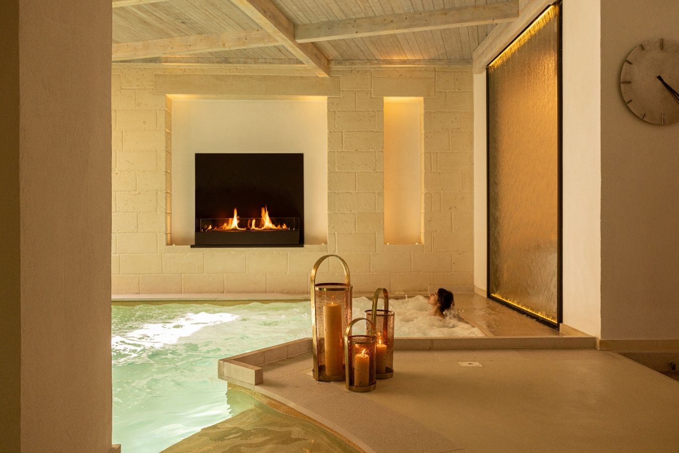 Wellness centre equipped with a Finnish sauna, a Turkish bath, a Kneipp path, an emotional shower and a heated indoor pool with whirlpool and hydromassage beds. Two massage rooms for singles and couples.
