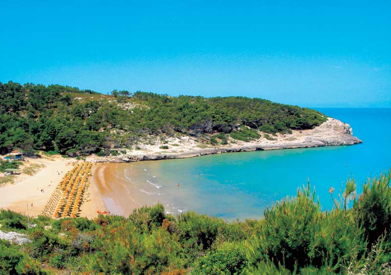 An oasis within the Gargano Nature Reserve enclosed between two reefs covered with Mediterranean scrub. The fine, golden, sandy beach can be reached through a natural rocky path. Clear warm waters. This quiet and peaceful site during the day gets busy and very lively at night.