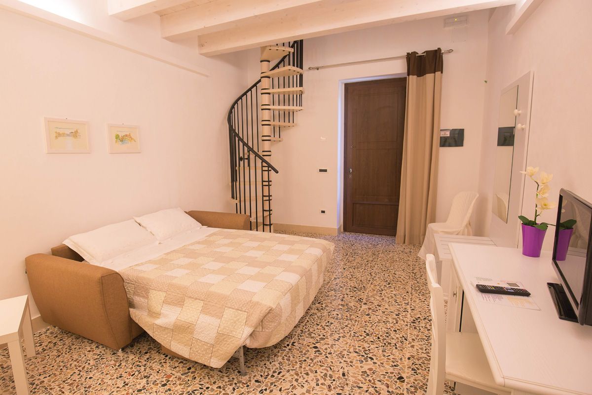 - 2 Camere deluxe con soppalco per 4 persone (58 m²): divano letto matrimoniale al piano terra, letto matrimoniale in soppalco; bagno con doccia