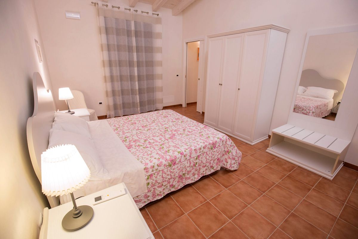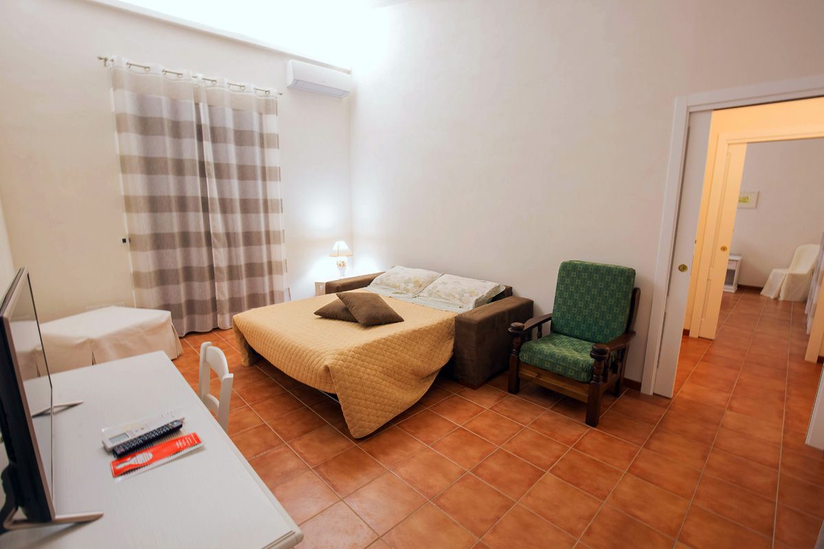 - 1 Suite per 2+2 persone (70 m²): bilocale con camera matrimoniale e salotto con due letti singoli, veranda privata attrezzata di 40 m², bagno con doccia