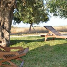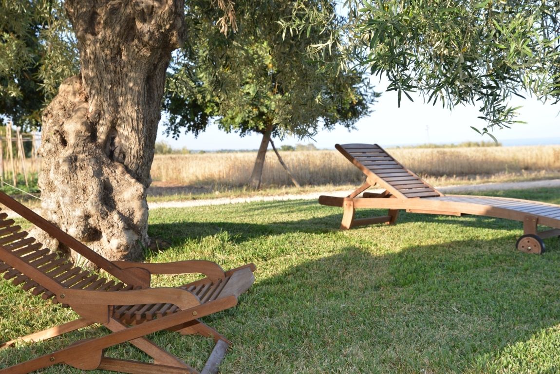 Zona relax con panchine all’ombra di ulivi secolari; ampia veranda porticata con divani e angolo bar; zona relax con chaise longues sul prato