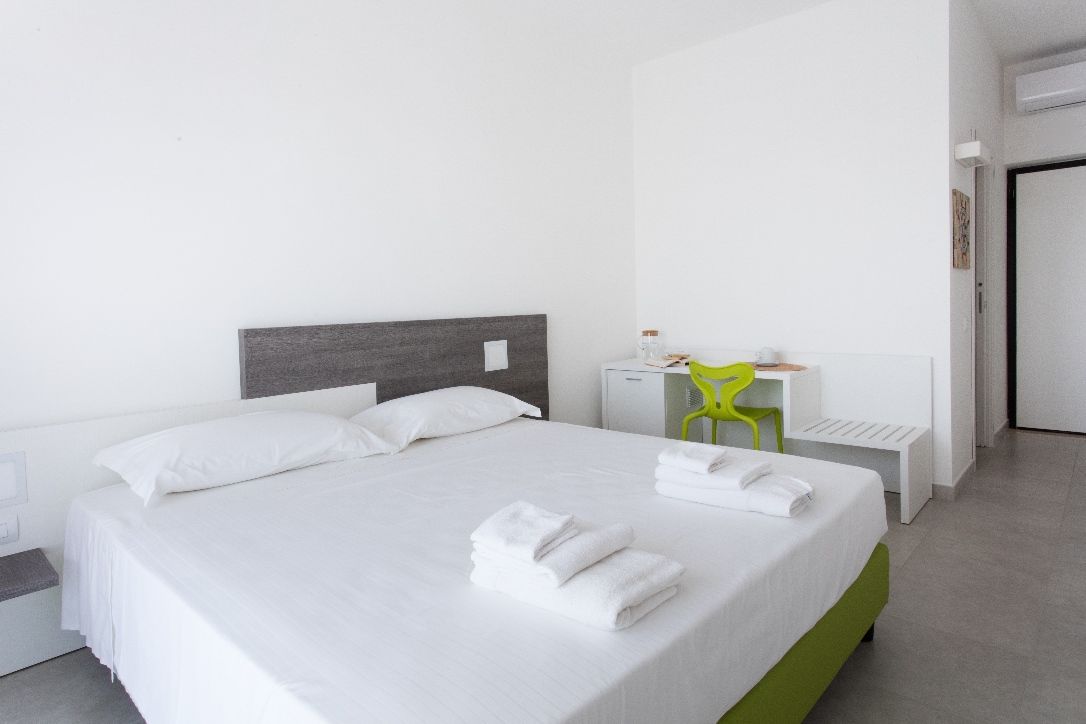 - 4 quadruple comfort vista mare (50 m²) per 4 persone; trilocali con camera matrimoniale con letto queen size, camera doppia con due letti singoli, living con divano, bagno con doccia; veranda attrezzata di 30 m², vista mare; ubicate al piano terra del corpo separato