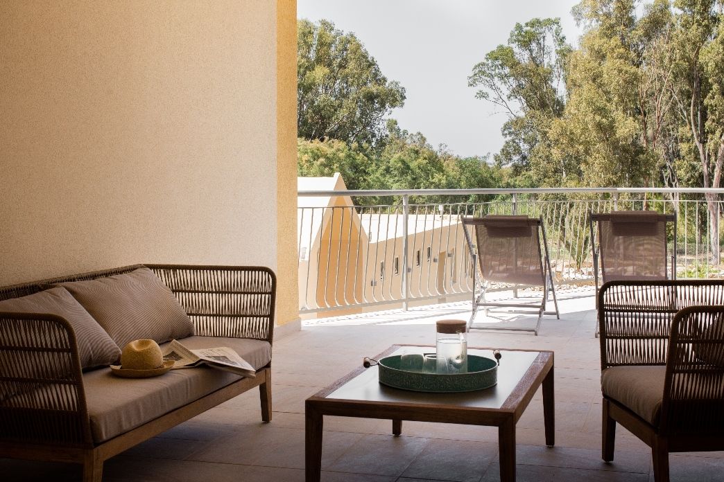 - 4 junior suites (30 m²) per 2+1 persone, con arredi eleganti, letto king size + singolo, bagno con doccia, veranda attrezzata di 20 m², vista pineta e piscina; ubicate al primo e secondo piano del corpo principale