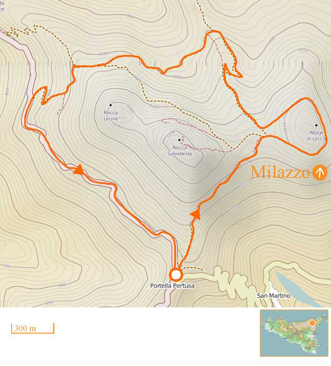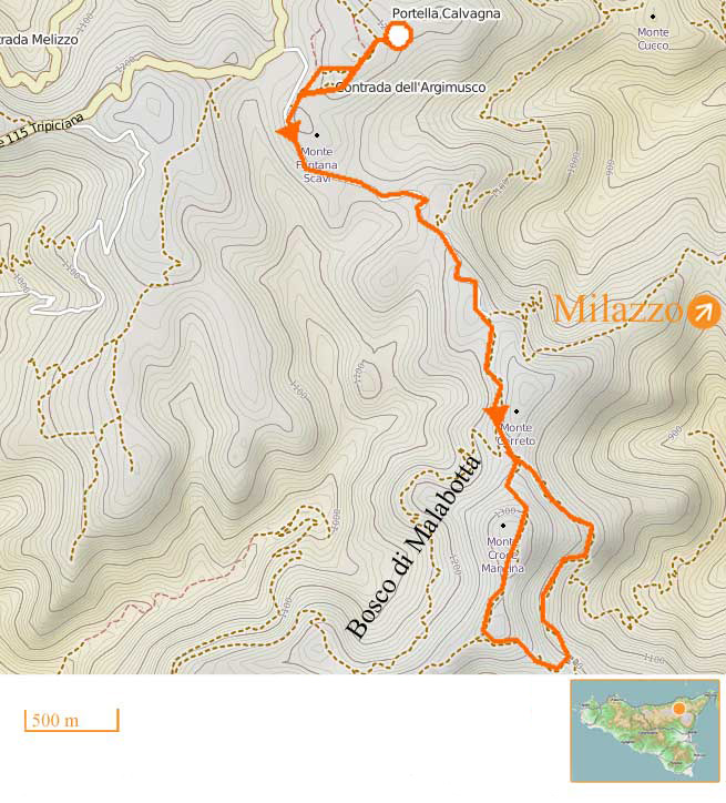 Itinerario naturalistico attraverso i boschi di querce della riserva di Malabotta e l'altopiano di Argimusco. I megaliti, i Menhir e le formazioni rocciose sono antichissime ed uniche in Sicilia. Il panorama é stupendo: a Nord le isole Eolie, a Sud l'Etna, ad Ovest la costa di Cefalù e ad Est Capo Milazzo e lo stretto di Messina.