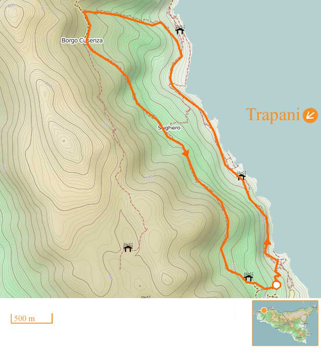 itinerario di grande bellezza, per i magnifici panorami sui Golfi di Bonagia e di Cofano e per la possibilità di osservare la ricca vegetazione mediterranea presente nella Riserva Naturale. Il percorso compie il periplo completo del promontorio calcareo. Alcune rovine interessanti lungo il cammino, tra cui una torre costiera del ‘500 e l’antica Tonnara di Cofano.