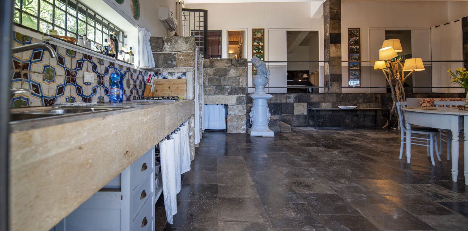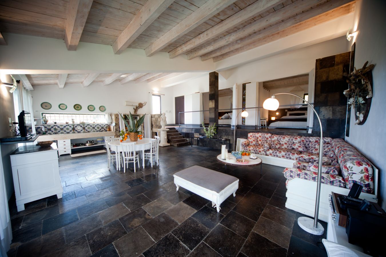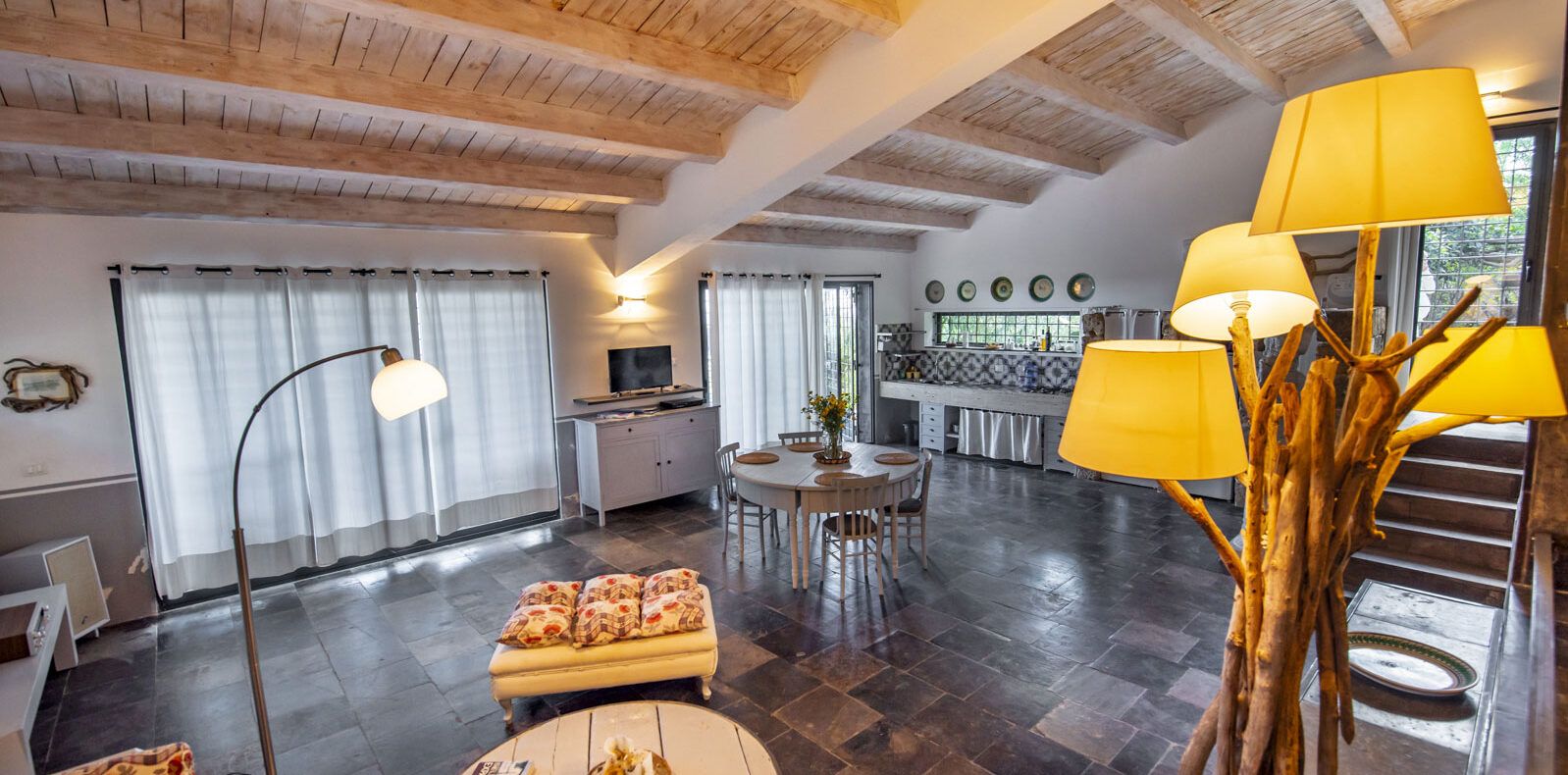 La Cava (150 m²): Villa con pavimenti in pietra nera e dettagli in maioliche antiche, composta da due camere da letto matrimoniali, di cui una con bagno privato, un secondo bagno, ampio soggiorno con vista mare e cucina all'americana, divano letto doppio. Grande veranda attrezzata con vista mare, giardino arredato, piscina al sale con solarium anche coperto