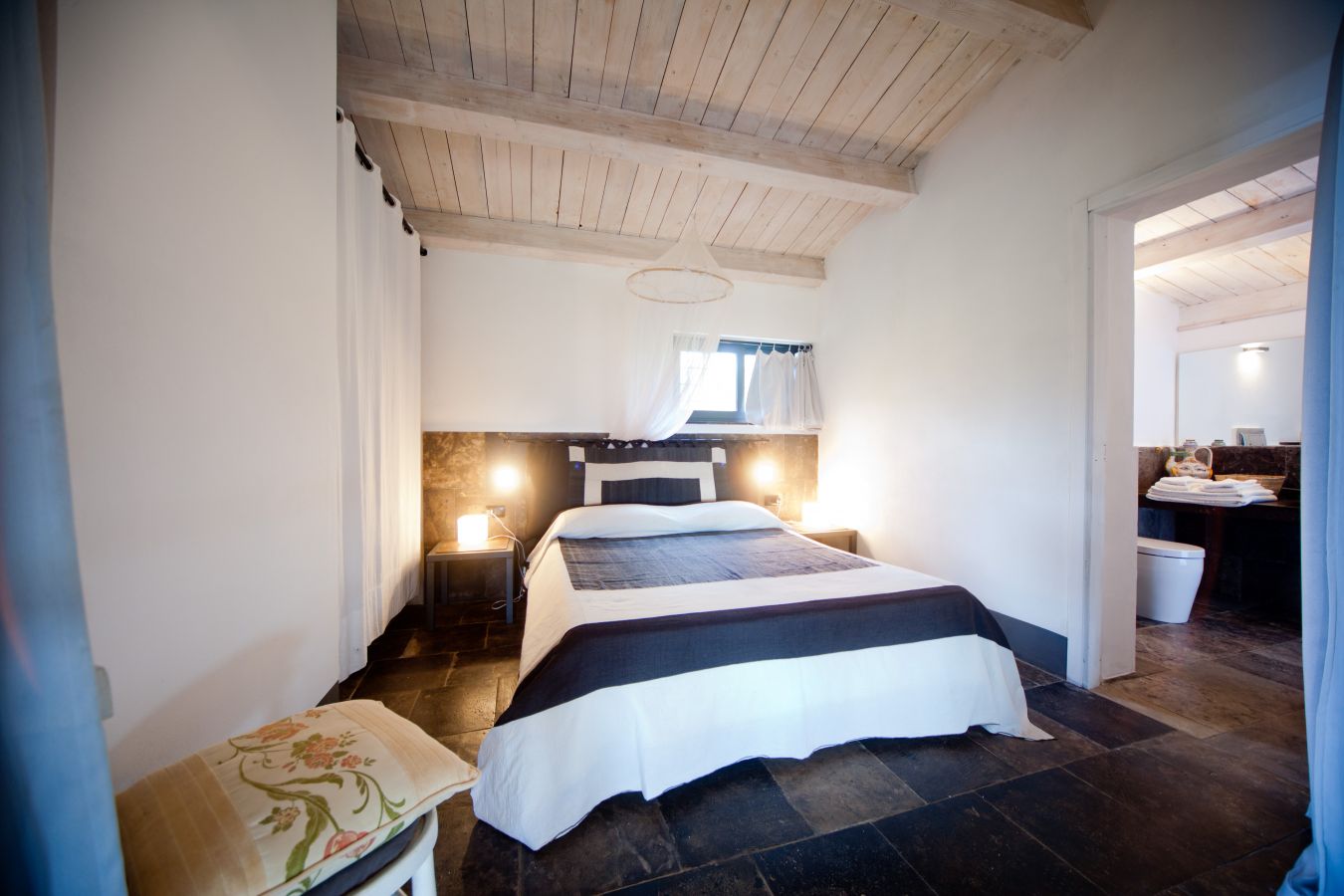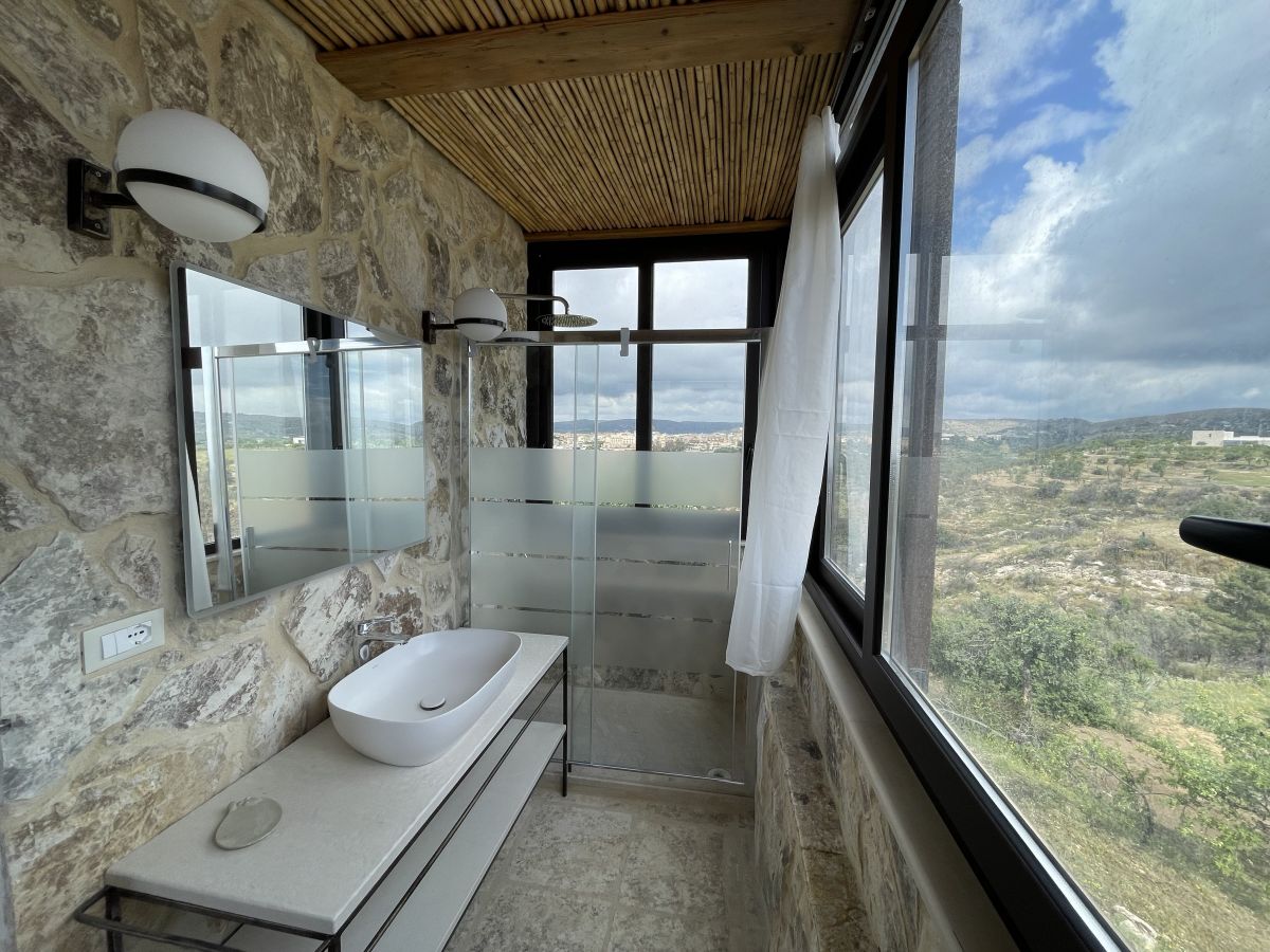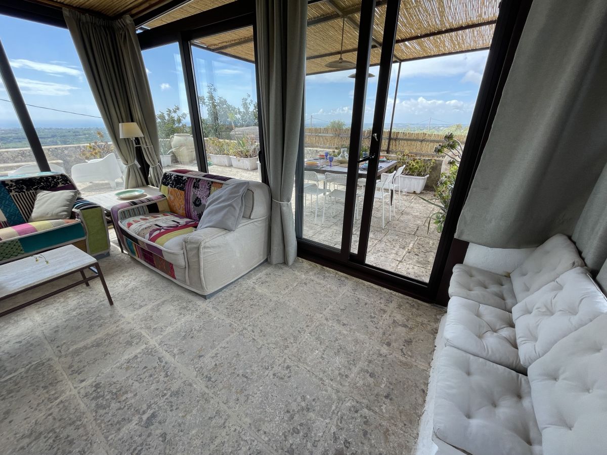 Il Dammuso (110 m²): Antica costruzione del XIII secolo con volte a botte in pietra e dettagli in maiolica di Caltagirone, composta da una camera da letto matrimoniale in soppalco, un bagno, ampio soggiorno con cucina all'americana, divano letto doppio. Al piano superiore, camera matrimoniale con bagno privato e terrazza con magnifico panorama su Noto e sul mare. Grande veranda attrezzata vista mare con pergolato in canne, piscina al sale con solarium. La villa è confinante con l’altra villa Il Carrubo